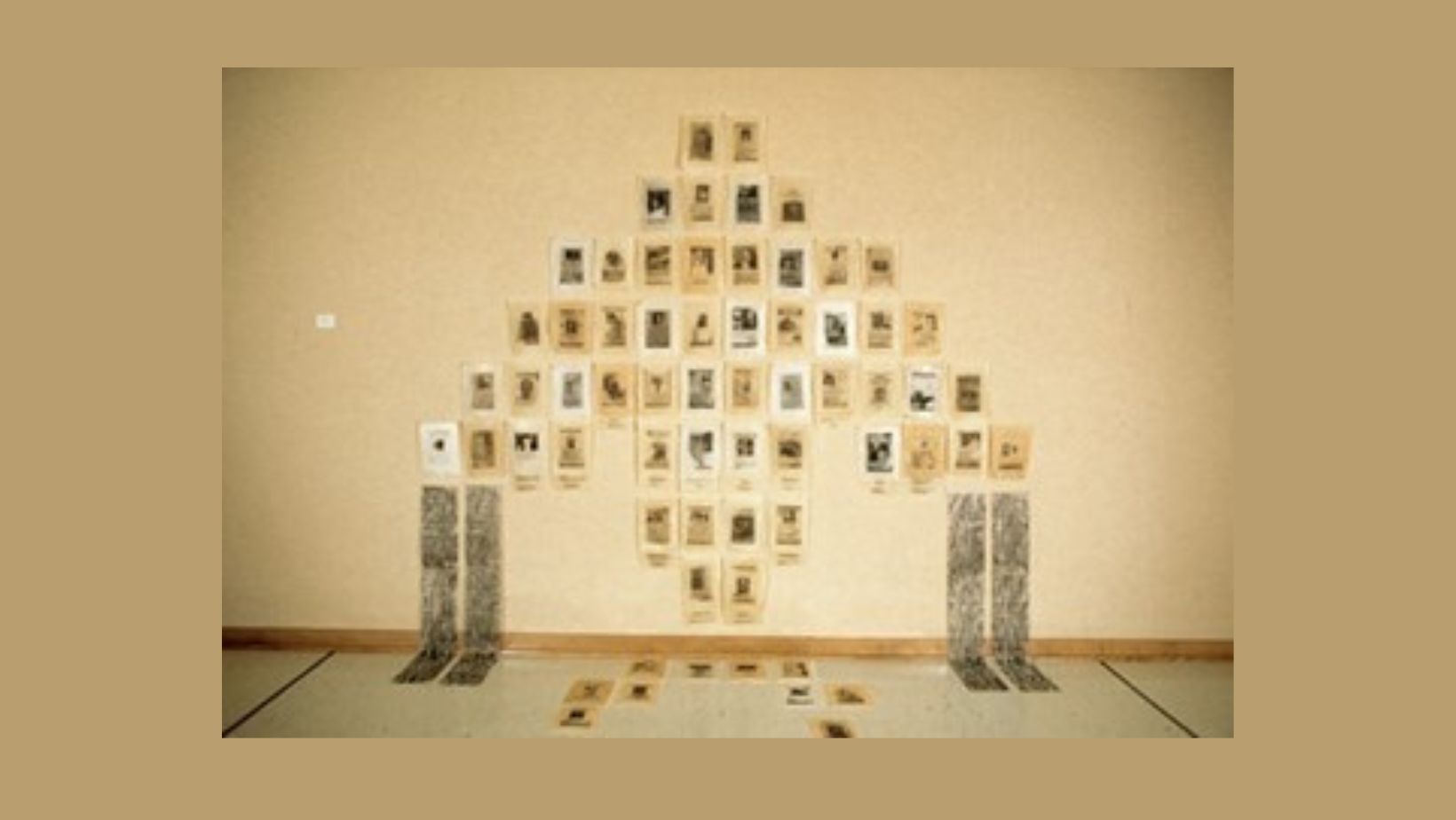 Installation artwork titled "Missing" by Barbara Siegel. The installation consists of 80 individual electrophotography and solvent transfers on paper lined with cheesecloth and coated with wax. 69 transfers depict 9/11 missing posters and 12 depict an original poem composed by the artist's husband, Gary Schwartz, titled "Os Urubus" which translates to "The Vultures." When the piece is installed, the composition arrangement can be variously described as resembling an airplane or a bird in flight, such as a Phoenix.