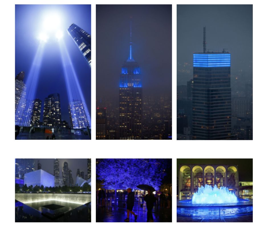 As an extension of Tribute in Light, we once again partnered with NYC & Company and buildings throughout the city who lit up their facades and rooftops in sky blue. Participants on the 21st anniversary included the Empire State Building, Bloomberg L.P., the Performing Arts Center at the World Trade Center, One World Trade Center, the Oculus, Brookfield Place, New York City Hall, RXR Realty buildings, the Helmsley Building, the Bank of America Tower, Barclays Bank U.S. Headquarters, One Vanderbilt, Lincoln Center for the Performing Arts, Museum of the City of New York, Queens Museum, New York Hall of Science, Queens Borough Hall, Niagara Falls, MTA Long Island Railroad East End Gateway at Penn Station, the H. Carl McCall SUNY Building, Empire State Plaza in Albany, the New York State Education Building, the Alfred E. Smith State Office Building, the New York State Fairgrounds, Albany International Airport Gateway, the Lake Placid Olympic Ski Jumping Complex, Luna Park in Coney Island, JFK Air Traffic Control Tower, LGA West Parking Garage, and bridges throughout the state including the Goethals Bridge, Bayonne Bridge, Kosciuszko Bridge, Governor Mario M. Cuomo Bridge, Fairport Lift Bridge, and the Franklin D. Roosevelt Mid-Hudson Bridge.