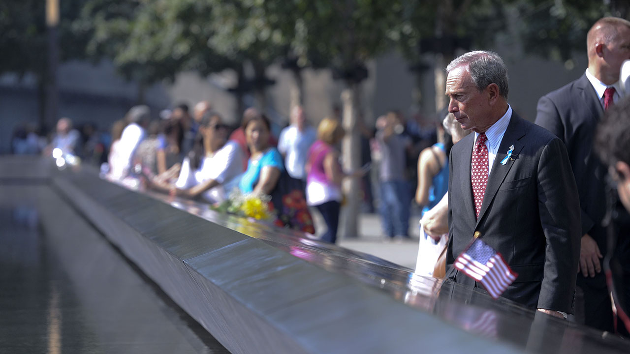 Michael Bloomberg, the chairman of the 9/11 Memorial & Museum, stands in a suit and tie beside a Memorial reflecting pool. In front of him, a bronze parapet runs along the border of the pool. A small American flag has been placed on the parapet.