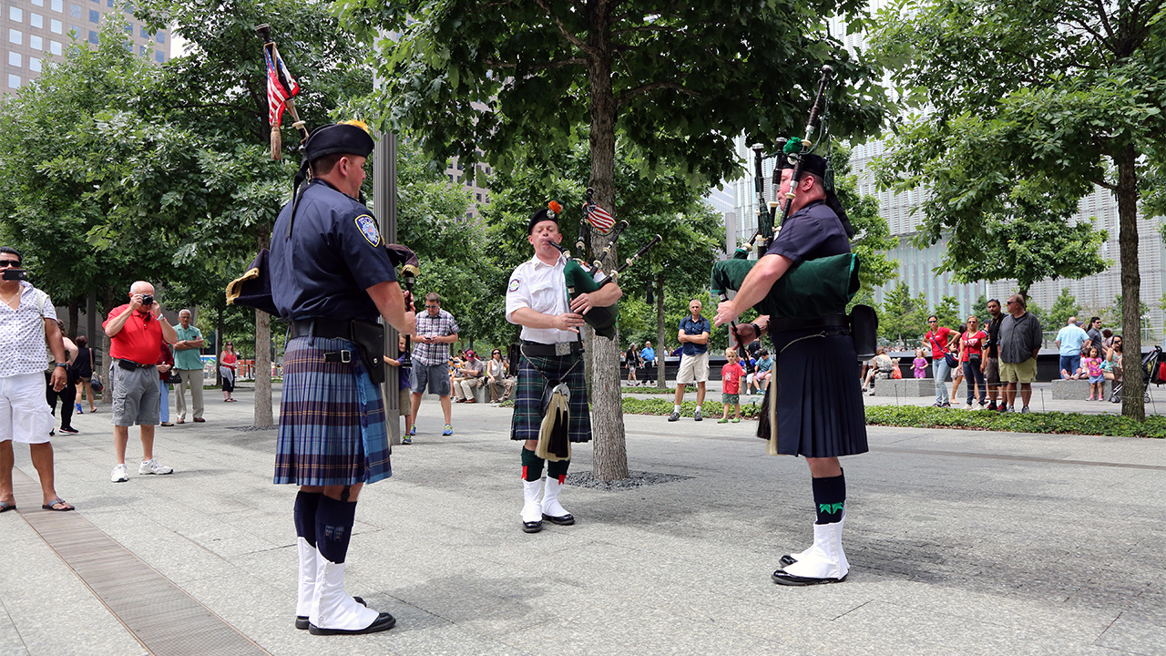 A weekly bagpipe tribute honors those who died on 9/11 as well as those who are sick or who have died from exposure to hazards and toxins in the aftermath of 9/11. Bagpipers play inside the Museum near the Last Column.