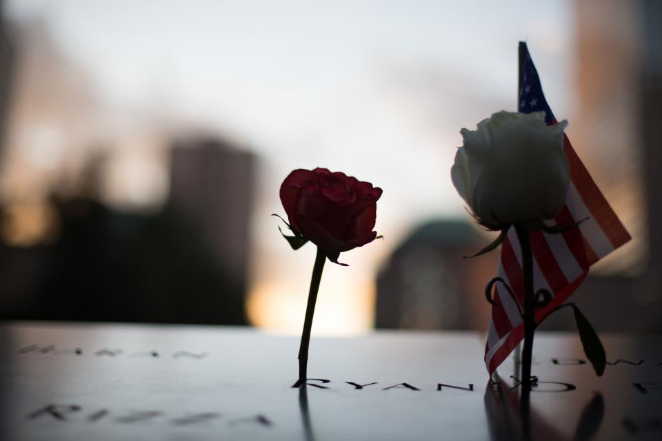 A red rose and a white rose stand beside a small American flag at a name on the 9/11 Memorial.