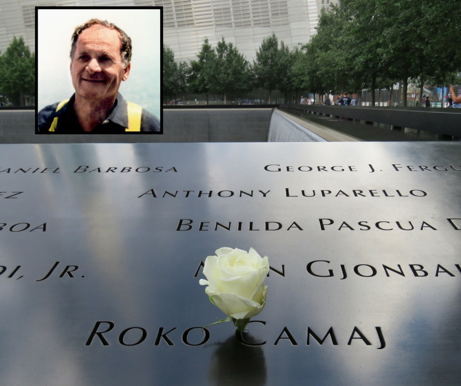 A white rose has been placed at the name of Roko Camaj at the 9/11 Memorial. An inset image of Camaj is at the top left of the image.
