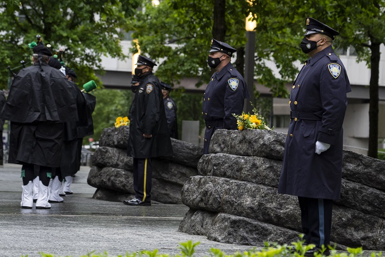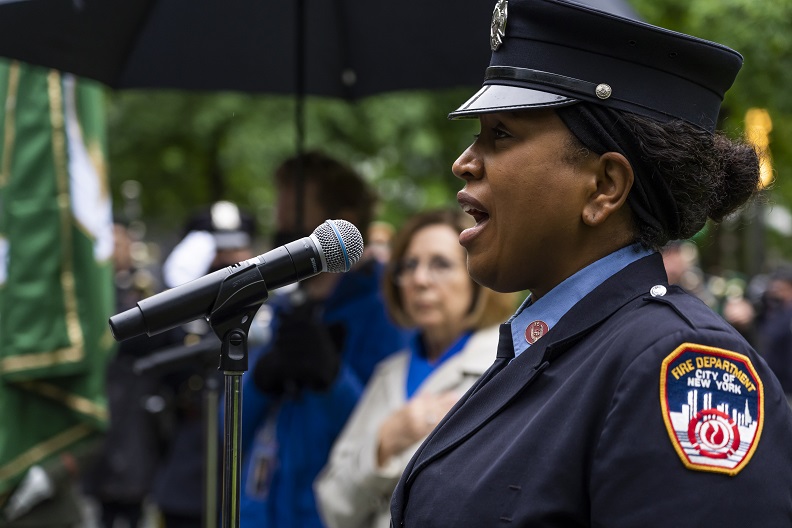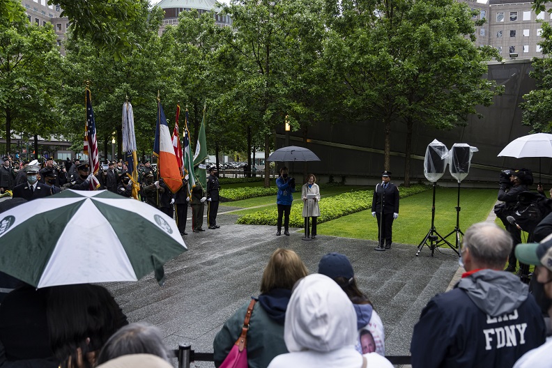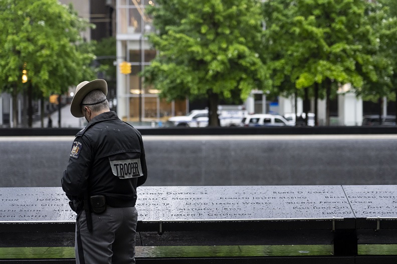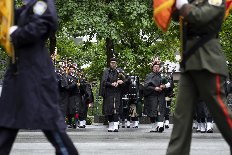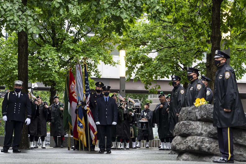 As 9/11 rescue, recovery, and relief workers, survivors and members of the lower Manhattan community, and families of those who have passed due to 9/11-related illnesses gathered on the 9/11 Memorial Glade, a moment of silence was held to mark the anniversary following an honor guard and singing of the national anthem. The Glade inscription was also read aloud to those in attendance and another musical tribute concluded the ceremony.