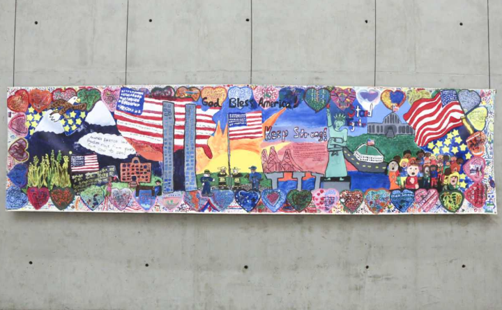 For years, the banner hung in Tribute Walk, an area in the Museum dedicated to artwork and objects created in remembrance of 9/11 by artists and ordinary people alike. While any museumgoer could gaze at the banner, it was an important piece to view for one group in particular: young students participating in guided school programs at the Museum. Countless third, fourth, and fifth graders have intently studied the banner created by children who were their age in 2001. Again and again, today’s students have remarked upon the love, compassion, and hope shown by even the youngest of Americans after the attacks.