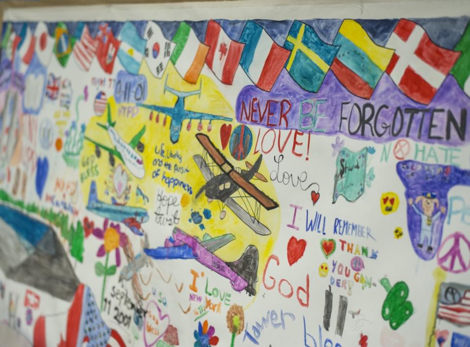 “Kids responded to the story of helping out. It made them think about what they could do and they expressed messages of love, unity and peace,” said 9/11 Memorial Museum Education Specialist Julianne Orouken. The young mural contributors also drew flags from their home countries in honor of world community.