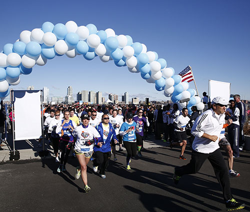 Dozens of people participating in the second annual 9/11 Memorial 5K Run/Walk jog past the start line, which consists of an arch made of blue and white balloons. The skyline of Jersey City can be seen in the distance on a sunny day.