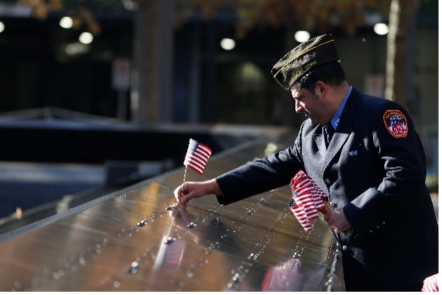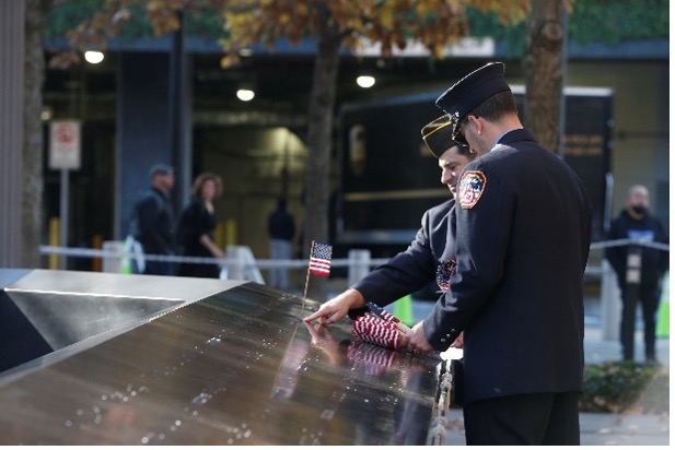 Members of the FDNY VFW Post 12033 visited us, placing American flags at the names of FDNY veterans on the Memorial.