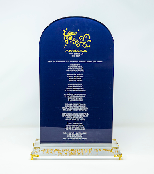A glass plaque from the Sino-American Friendship Folk Museum in Hangzhou, Zhejiang, People’s Republic of China, has made its way halfway around the world and arrived as a gift to the Museum commemorating the 20th anniversary of 9/11. Inscribed on it is a Chinese poem paying homage to the resilience and spirit of New Yorkers and the American people as a whole in response to the attacks.