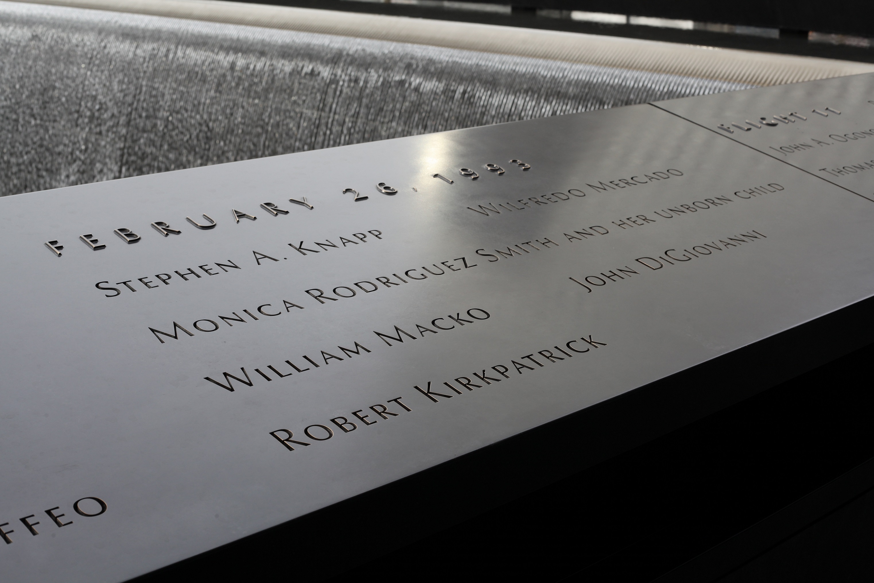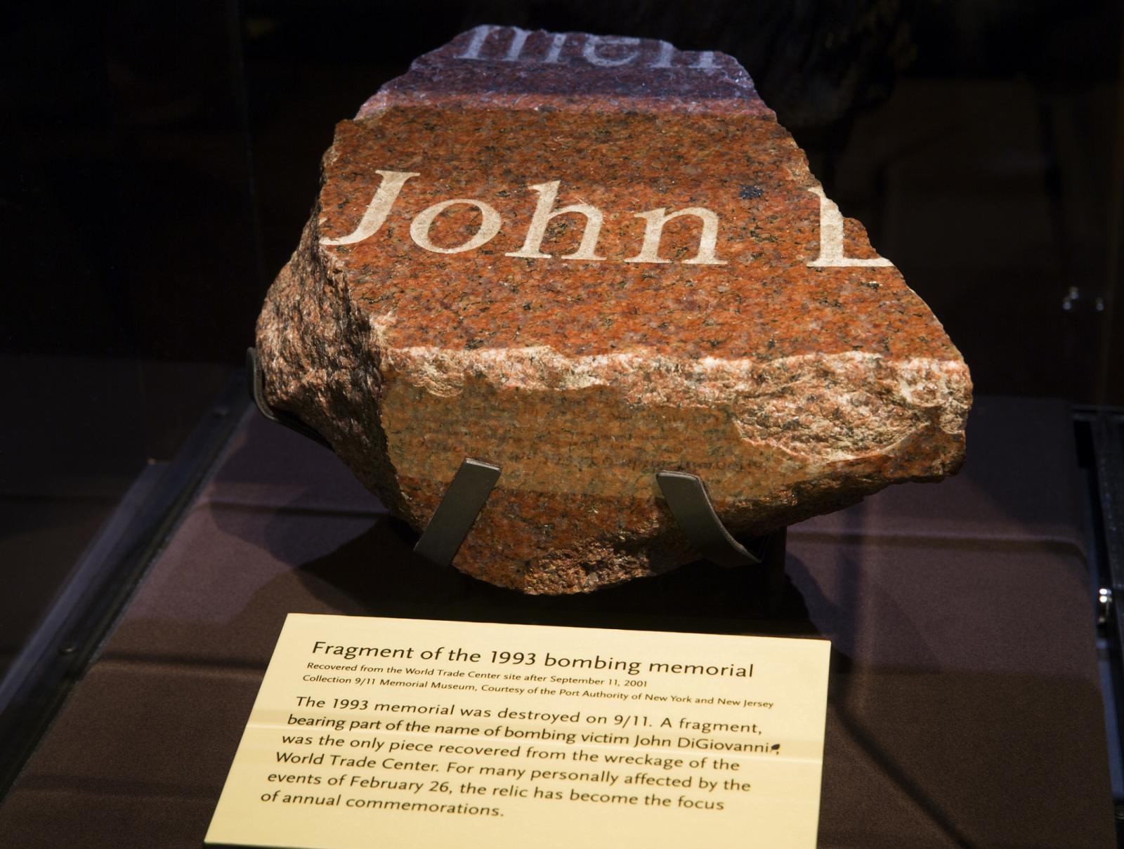 After the 1993 bombing, two memorials commemorated the victims of the attack. First, a brass plaque bearing the victims' names was installed near the location of the bomb on the B-2 level of the North Tower. A memorial fountain was later dedicated on the Plaza between the towers. Both memorials were destroyed in the attacks of September 11, 2001. A small piece of the fountain was recovered and rededicated on February 26, 2005, the 12-year anniversary of the bombing. The memorial fragment was donated to the 9/11 Memorial Museum’s permanent collection by the Port Authority of New York and New Jersey.