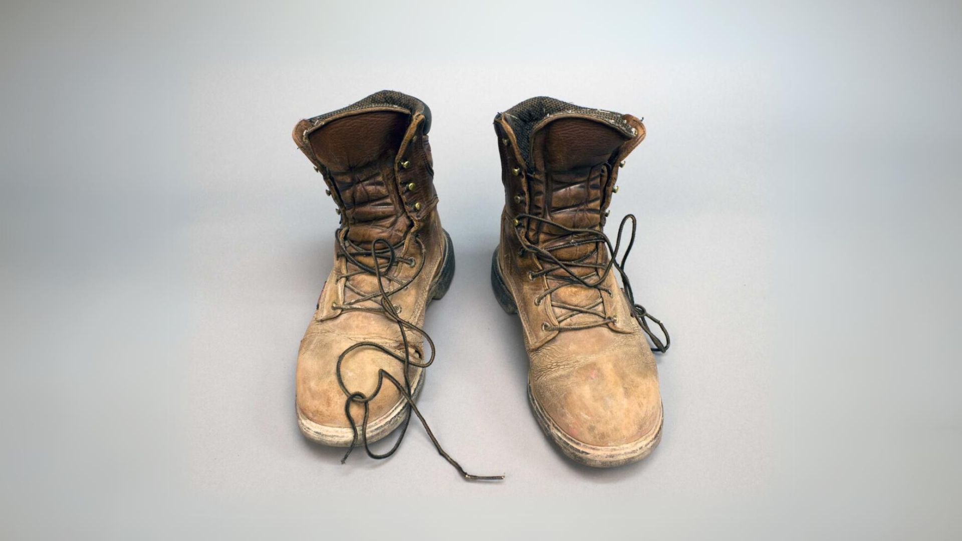 Row 2: (Left) Pair of Red Wings Gore-Text boots, with leather visibly dry and cracked. A layer of dust and dirt is also present. Collection 9/11 Memorial & Museum, Gift of devotion from the Lyons family. (Right) Dust at Ground Zero as seen in a scanning electron microscope. Collection 9/11 Memorial & Museum, © by David Scharf 2002