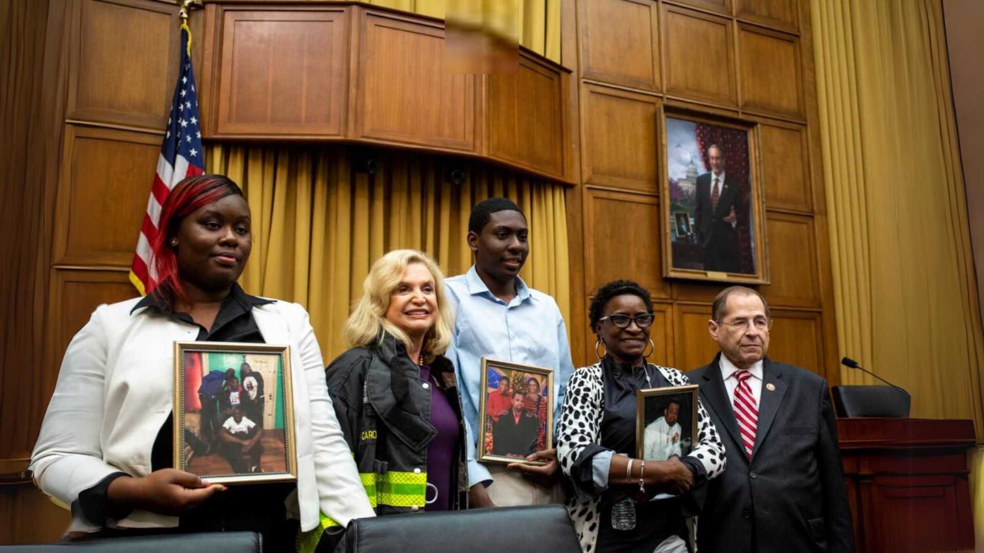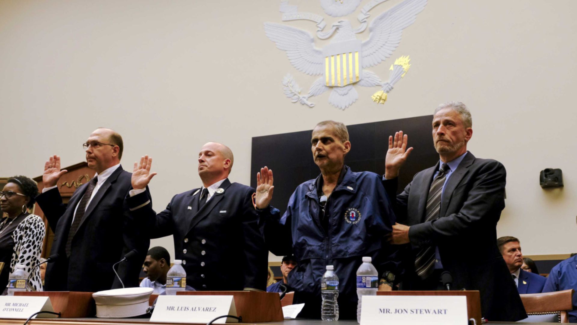 Row 4: (Left) Family of Candidus Henry, a deceased construction worker, with Rep. Carolyn B. Maloney (D-NY) and Chairman, Rep. Jerrold Nadler (D-NY) following the hearing on H.R. 1237: "The Need to Reauthorize the September 11th Victim Compensation Fund." Collection 9/11 Memorial & Museum, Gift of FealGood Foundation and Faye Murman-Dorsey. (Right) Tom Mohnal (FBI), Michael O'Connell (FDNY), Luis Alvarez (NYPD), and Jon Stewart are sworn in before testifying as part of the second witness panel at the same hearing. Collection 9/11 Memorial & Museum, Gift of FealGood Foundation and Faye Murman-Dorsey.