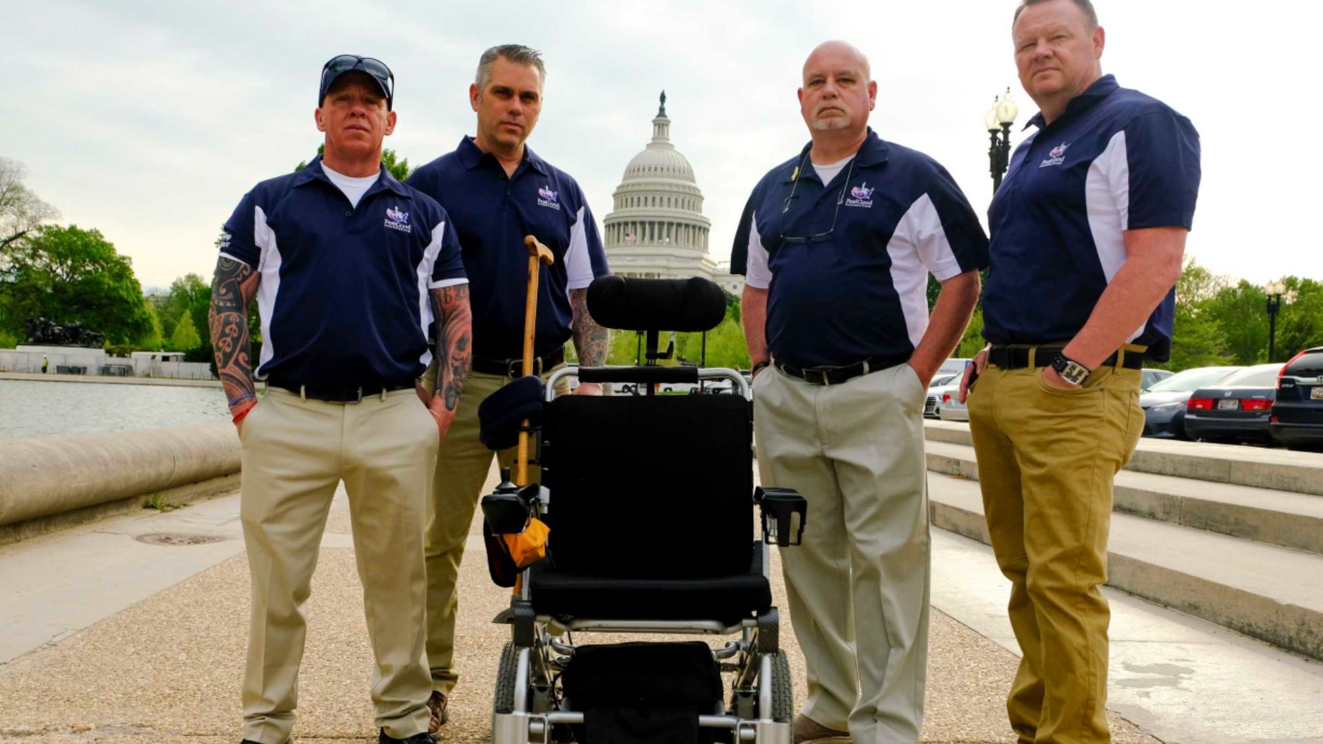 Row 5: (Left) Members of the FealGood Foundation, including, from left, John Feal, Keith Delmar (FDNY), Richard Palmer (DOC), and Kenny Specht (FDNY) in Washington, D.C. Collection 9/11 Memorial & Museum, Gift of FealGood Foundation and Faye Murman-Dorsey. (Right) FDNY EMT class gathers on the Memorial plaza. 9/11 Memorial & Museum, Photograph by Jin S. Lee.