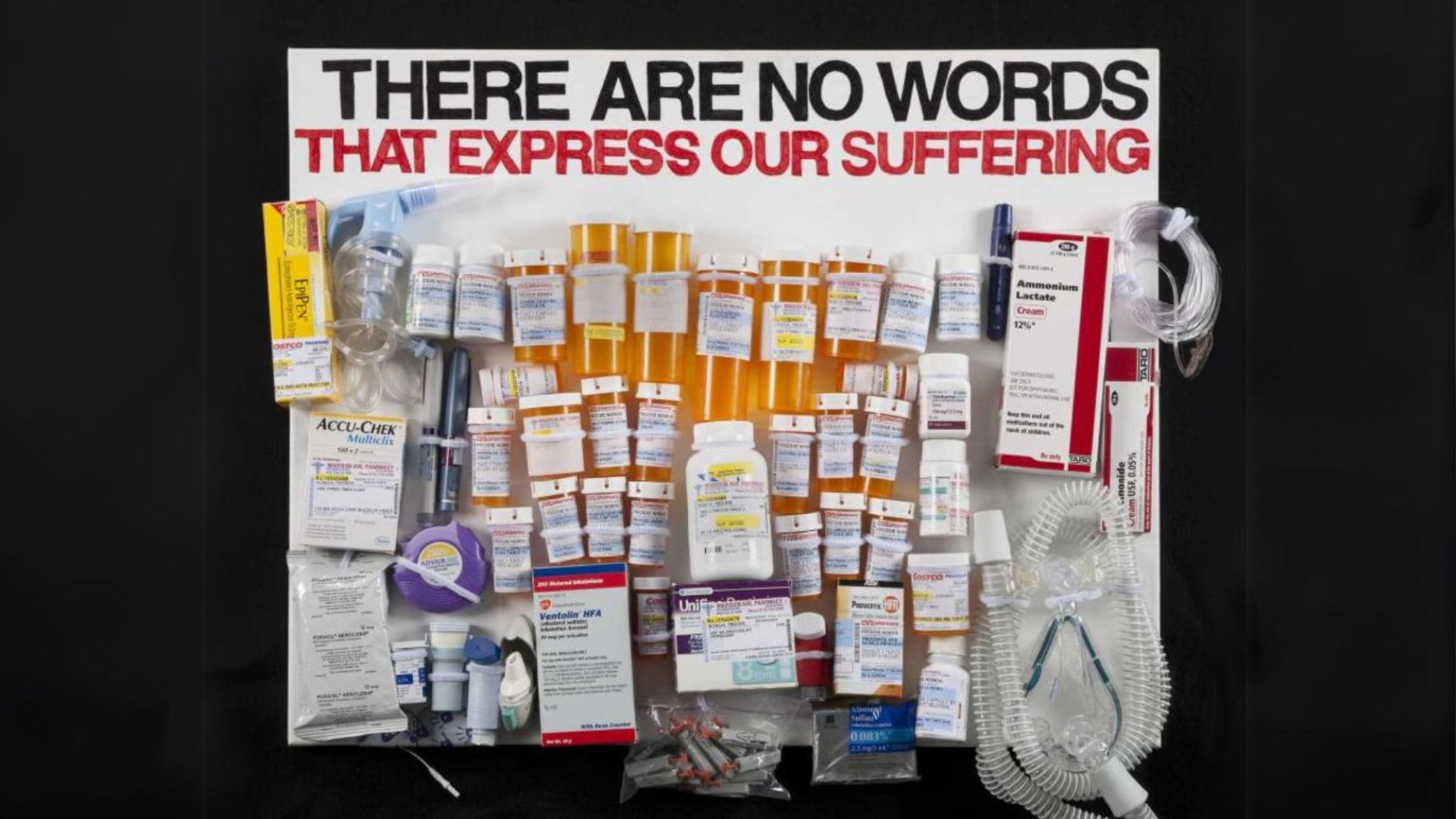 Row 3: (Left) Lucelly Gil, a cleaning woman who worked at buildings near Ground Zero, poses with an array of the medications she takes to treat various 9/11-related health issues. Collection 9/11 Memorial & Museum, © Allan Tannenbaum. All rights reserved. (Right) Protest sign with empty pill bottles. Collection 9/11 Memorial & Museum, Gift of Freddie Noboa, Photograph by Matt Flynn.