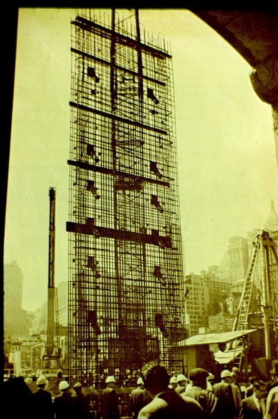 Photograph of a reinforcing steel cage being lowered into a trench to construct a portion of the slurry wall in 1967. Collection 9/11 Memorial Museum, Gift of Arturo L. Ressi di Cervia.