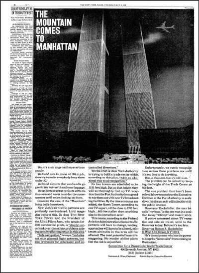 The World Trade Center’s place in New York City’s skyline earned it iconic landmark status throughout its lifetime. Featured in movies, television shows, commercials, and other media, the Twin Towers’ silhouette was recognizable throughout the world. But constructing and operating some of the largest and most symbolic facilities in the world came with unforeseen consequences. An advertisement paid for by the Committee for a Reasonable World Trade Center and printed in the New York Times on May 2, 1968, warned of the risk the towers’ height posed to air navigation. The advertisement’s artwork, shown in the image to the left, depicts an airplane flying precariously close to the top of the North Tower. Though the Committee points out the hazard of having to change flight patterns and minimum altitudes to accommodate these new aerial obstacles, no one ever imagined a scenario where airliners would be intentionally crashed into the towers. This “failure of imagination” as later described by the 9/11 Commission that was set up to investigate the circumstances surrounding the attacks, included our inability to look beyond our aspirations of building tall and see the towers’ vulnerability.