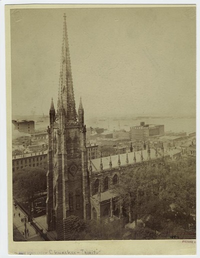 Trinity Church, New York City, photographed from the roof of the Equitable Building, circa 1889. Courtesy of the Miriam and Ira D. Wallach Division of Art, Prints and Photographs: Picture Collection, The New York Public Library.
