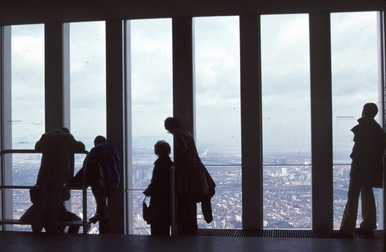 Visitors at the South Tower’s 107th floor observatory, December 1975. Collection 9/11 Memorial Museum, Gift of William Raff, survivor, South Tower, 82nd floor.