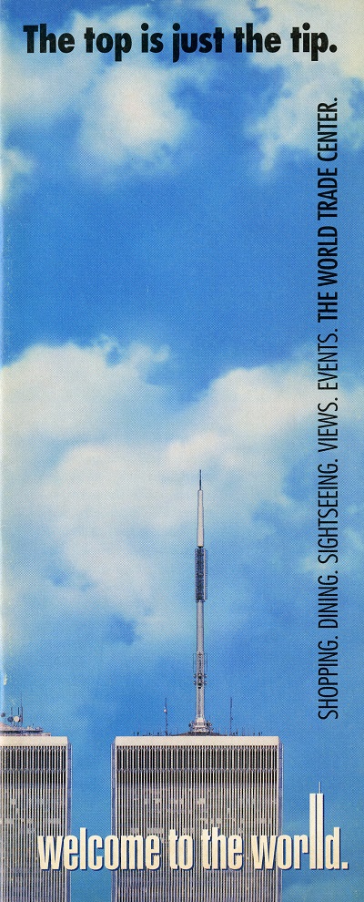 Front cover of a booklet produced by the Port Authority of New York and New Jersey with information about visiting the World Trade Center and the many attractions and amenities offered, circa 1994. Collection 9/11 Memorial Museum, Gift of Rae Ann Hoffmann.