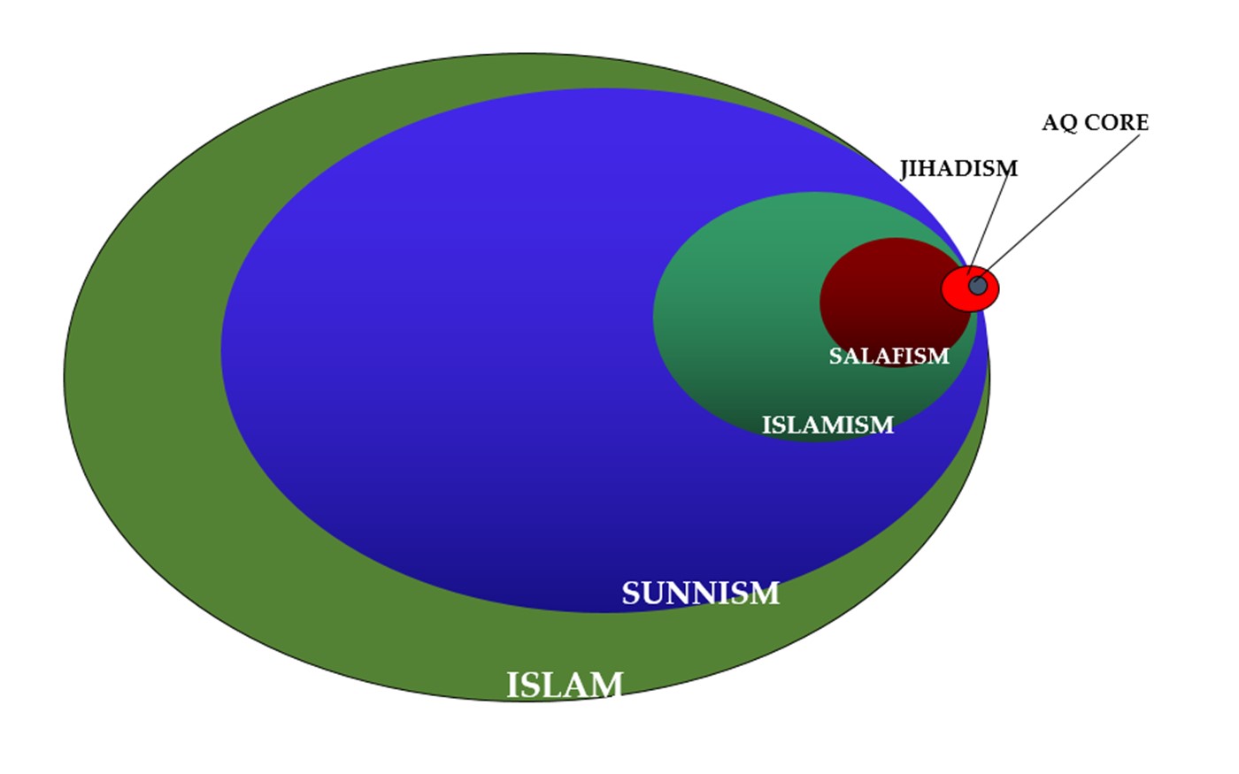 2. Display or distribute copies of the graphic below from the Combating Terrorism Center at West Point. This can be done as a class or in small groups. Note: The small bright red circle denotes Islamist extremists. The black dot within the red circle denotes al-Qaeda. Ask students to look at the graphic and respond to the following questions: