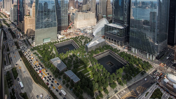Memorial Plaza is seen from above. The aerial view shows the Plaza’s many trees, as well as the reflecting pools and Museum Pavilion. Rows of traffic pass on West Street to the left of the Plaza. The buildings of lower Manhattan are in the background.