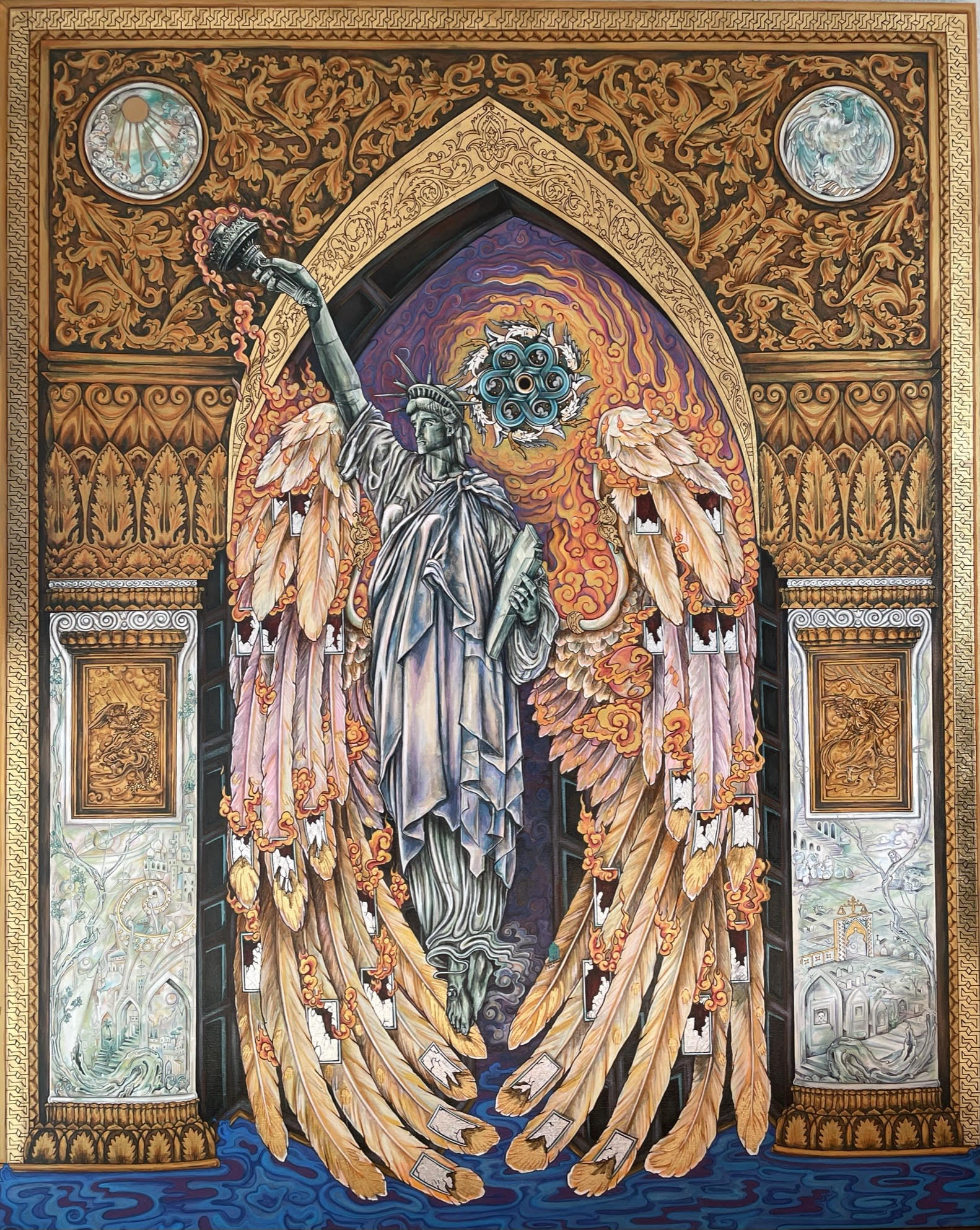 The events of September 11th conjure images of fire, ash, and agony as evil darkness was unleashed and flames consumed the towers. The safety of a nation deeply wounded the Statue of Liberty stands as a symbol of freedom rising above the ashes as a beacon of hope, a guardian angel pure, immortal, and determined. As an Iraqi American artist, Diyar's appreciation of freedom comes from his experience as a refugee fleeing war-torn Iraq in 2004. This work is a tribute to the fragility of freedom through immigrant eyes. The statue represents strength and freedom. The broken crown symbolizes a wound of humiliation. The nails on the feet are symbolic of the crucifixion of Christ. The bent torch symbolizes wisdom guidance, which is mishandled and setting fire to the angel's wings. The circle on top of the left column represents life energy and creation. Within the Golden inlay is an angel welcoming new beginnings a bearer of plenty excess. Continuing down the marble detailing relieves images of adventure wonder and rebirth. At the top of the right column, an eagle is clutching the American flag, imbodying strength courage honor, and immortality. The angel is the counterpoint to the one on the left calmly ushering souls into the afterlife below the Arches and trees are mirrored in the Marble, however, Death is depicted here while universal scales cast judgment over the entrance to the burial ground. In the center of the fireball is a spinning Celtic knot extinguishing the flames while the outer ring represents the many faces of God’s protection. The angel is in turmoil the flames represent tragedy, adversity, and the loss of innocence. The smashed windows of the world trade center represent a painful past and the permanent scars to bear, however, the feathers remain resolute bearing the strength to overcome and triumph.