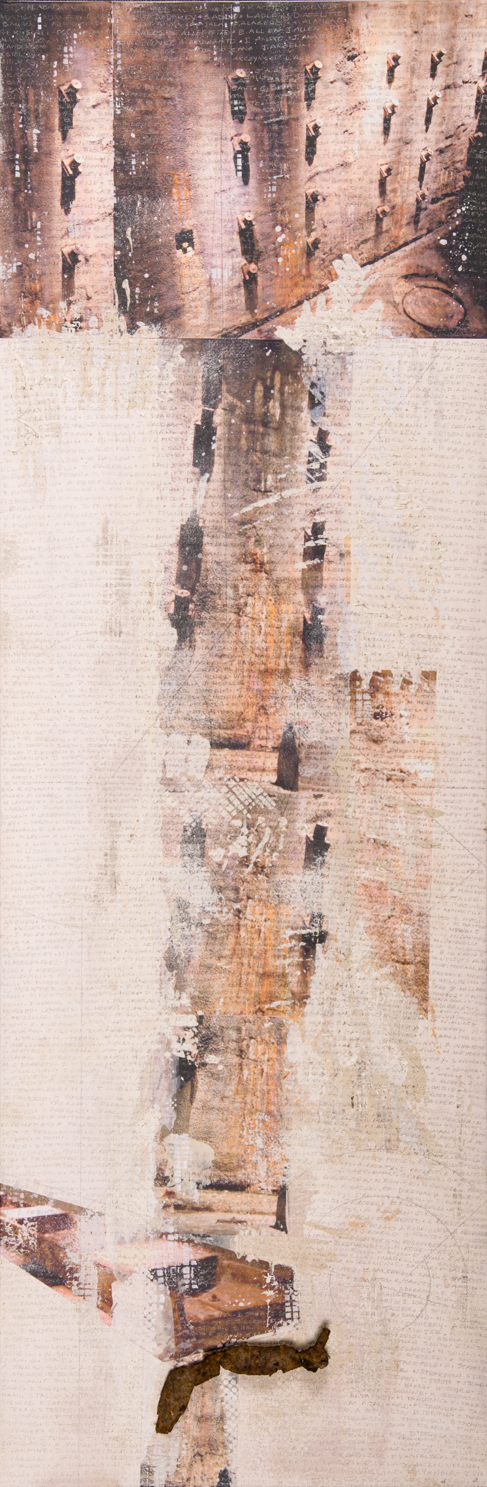 Collage work with photographs from the slurry wall. Names of each one of the victims who died at the WTC are written in pencil across the canvas. The lists of these are also posted on the back of the piece on 3 sheets of copy paper, printing in 5 point. The piece of metal debris is symbolic only and not from the site.