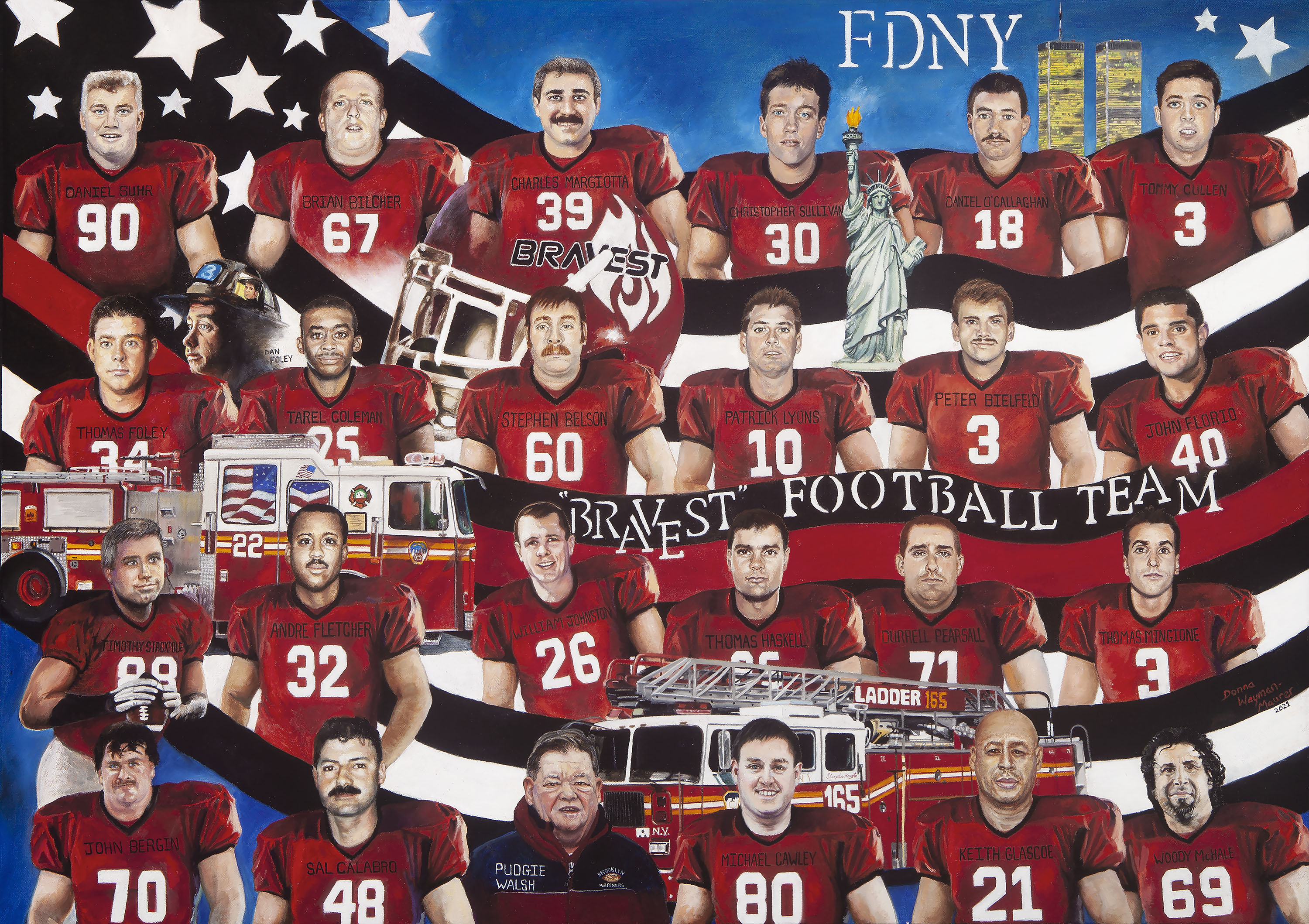 I had the extreme honor of being asked to paint 25 FDNY firefighters who died on 9/11 or because of 9/11. All of these extraordinary men were on the FDNY Bravest Football team. The painting is a celebration of their lives. The firefighters in this painting loved their job. Many of them were not on call on 9/11 but when they heard the call they came running with no thought of their personal safety. This wasn't just a job it was their life. The Heart, Bravery and Dedication to help others is to be admired. Studying each man as I painted them was very emotional. I was so inspired by all their stories. I have so much admiration for these firefighters who gave their lives that day.