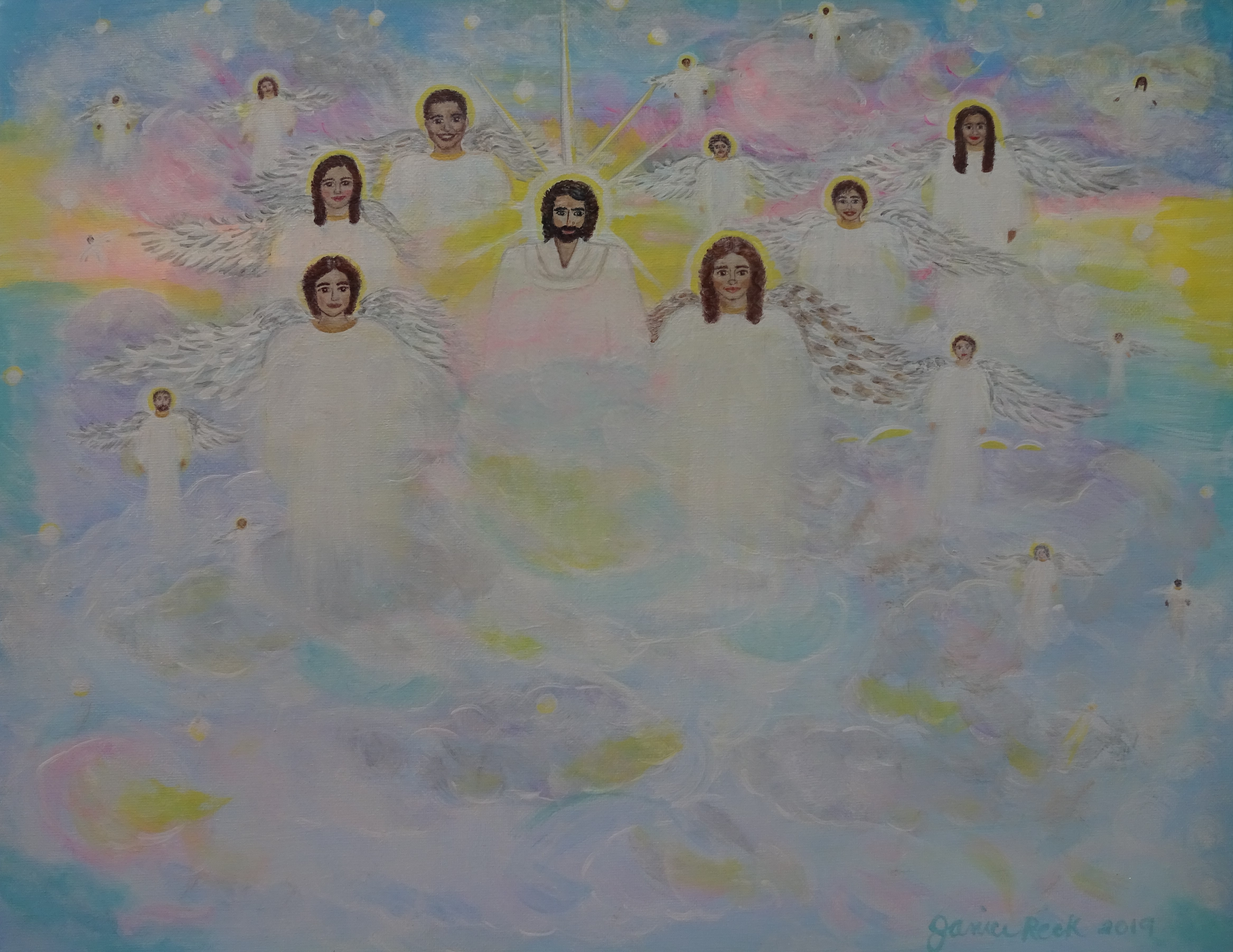 The sun was in my eyes, but amidst the clouds, I saw the images of Jesus, Archangel Michael and Archangel Gabriel, and others. They are the three I remember ascending to heaven with me. I was being told ‘the others’ were my friends and coworkers who perished on 9/11/01, because as usual, I had been thinking about them all day. I would later paint this vision you see here. Jesus’ face was the most prevalent in my vision and Michael’s and Gabriel’s faces were visible, but the others were mostly bright white lights with wings. I painted in the faces of some of the people I felt God was showing me were there.