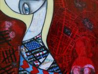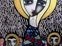 Her art is a highly metaphoric form of story telling meant to convey her life experiences & evoke emotion in the viewer. With her folk art styling & iconic imagery, she paints haunting narrative tales of love, life, death, the afterlife, dreams, heartache, heartbreak, loss, whimsy & punk rock, often with conceptual elements & humor. Repetitions of theme, elements, color & design create cohesion throughout her paintings with each piece telling a portion of a story until the story is complete.