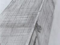Drawing from the bottom looking up at one of the twin towers with flags in front
