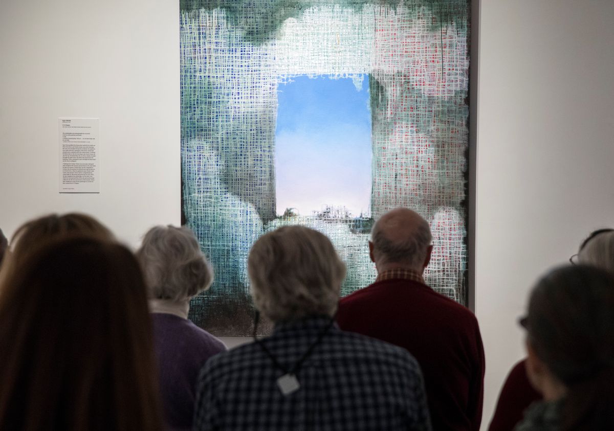 A group of people stand in the Museum, backs to the camera. In the foreground, a service dog faces the camera.