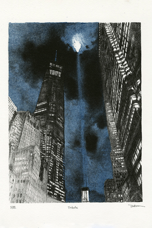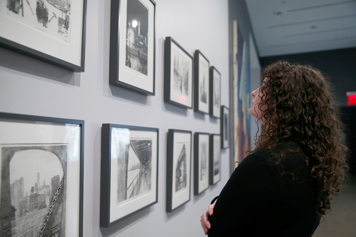 The exhibition featured well-known artists and architects such as Fritz Koenig, Daniel Libeskind, and Michael Arad, all of whom have strong connections to the World Trade Center site. Also included was a portfolio of sketches by Lili Réthi and Nicholas Solovioff, on behalf of the Port Authority, to document the original construction in the 1960s and 1970s. Another featured collection is from FDNY-firefighter-turned-artist Brenda Berkman, who also narrates the audio guide tour stop that provides an overview for this exhibition. For more details about the artwork, visit the Towers Rising: Envisioning the World Trade Center Before and After 9/11 virtual feature gallery on Inside the Collection.