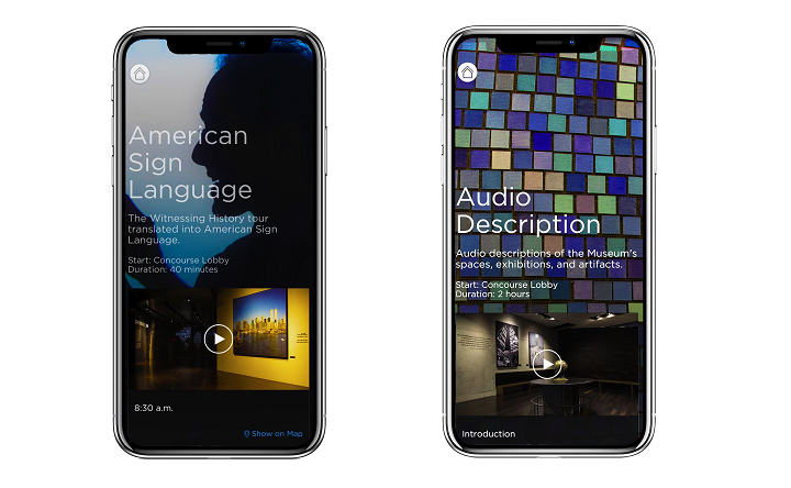 Two audio guide devices showing the homepages of a pair of tours, one entitled,  Witnessing History in American Sign Language and the other Audio Described Tour.