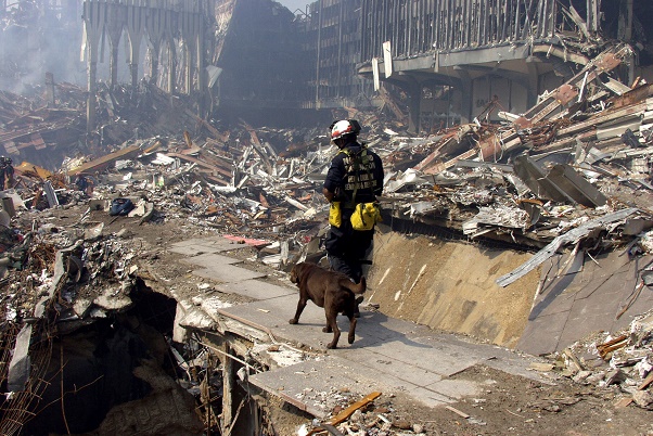 After September 11, 2001, K-9 teams searched the wreckage of the crash sites for survivors and victims, and they comforted responders and the families of victims. When images of the dogs at work appeared in news coverage, they brightened 9/11’s dark aftermath.